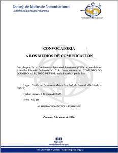 Los obispos de la Conferencia Episcopal Panameña (CEP), al concluir su Asamblea Plenaria Ordinaria N° 224, darán conocer el COMUNICADO DIRIGIDO AL PUEBLO DE DIOS, en la Eucaristía por la Paz.